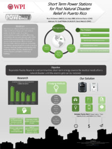The Great Problems Seminar is a semester long class students take their freshmen year at WPI. It involves doing research on a large real world problem and coming up with a solution. My team wanted to solve post hurricane Maria energy issues in Puerto Rico. We researched mental and physical health problems of living without electricity and narrowed the problem to meet the needs of small families. We conducted interviews with experts and researched potential solutions. Finally, we developed a concept for a cost-effective battery-based solution that would provide energy to sustain small electrical medical devices as well as other electronic devices that will improve the mental health of a hurricane survivor.